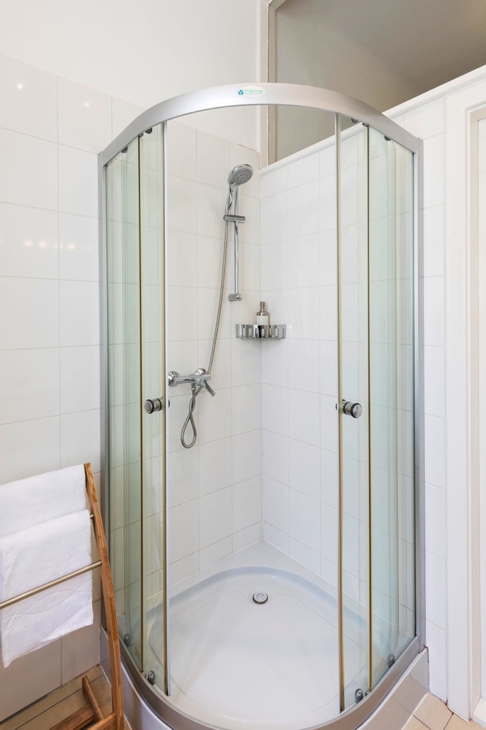 The bathroom has a shower and sink and the toilet is in a separate room.